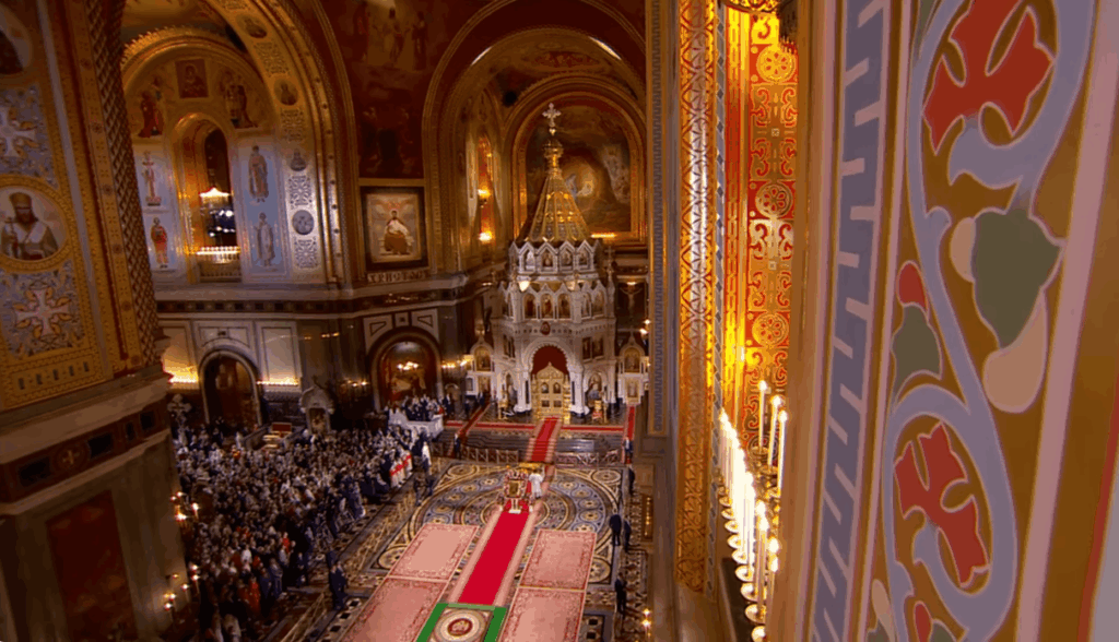 Сначала с Воскресением Христовым поздравляют друг друга священнослужители в алтаре. Потом они выходят из алтаря с крестом, Евангелием и иконами, становятся перед царскими вратами, лицом к молящимся в храме. Прихожане целуют Евангелие, крест и иконы и христосуются между собой.